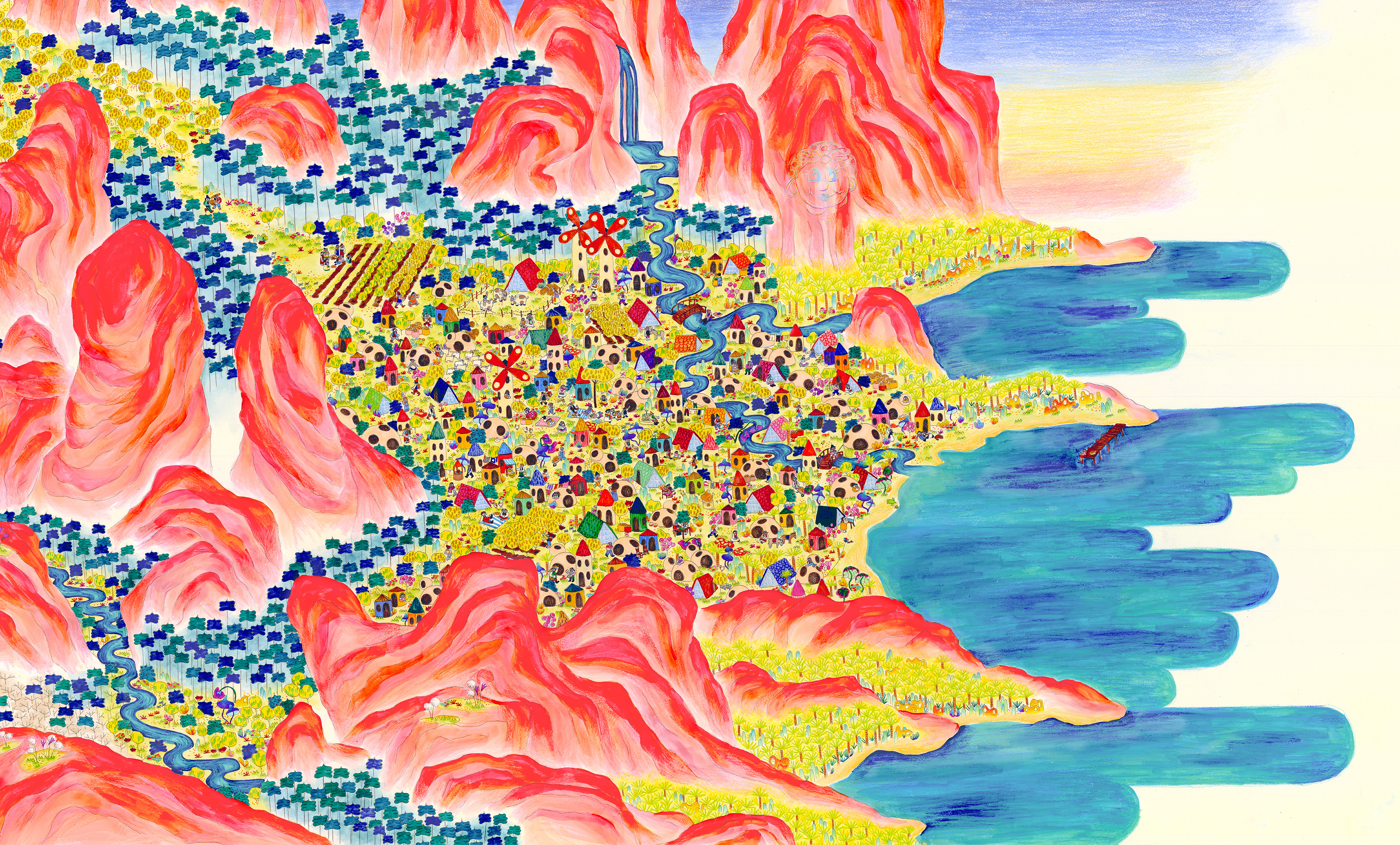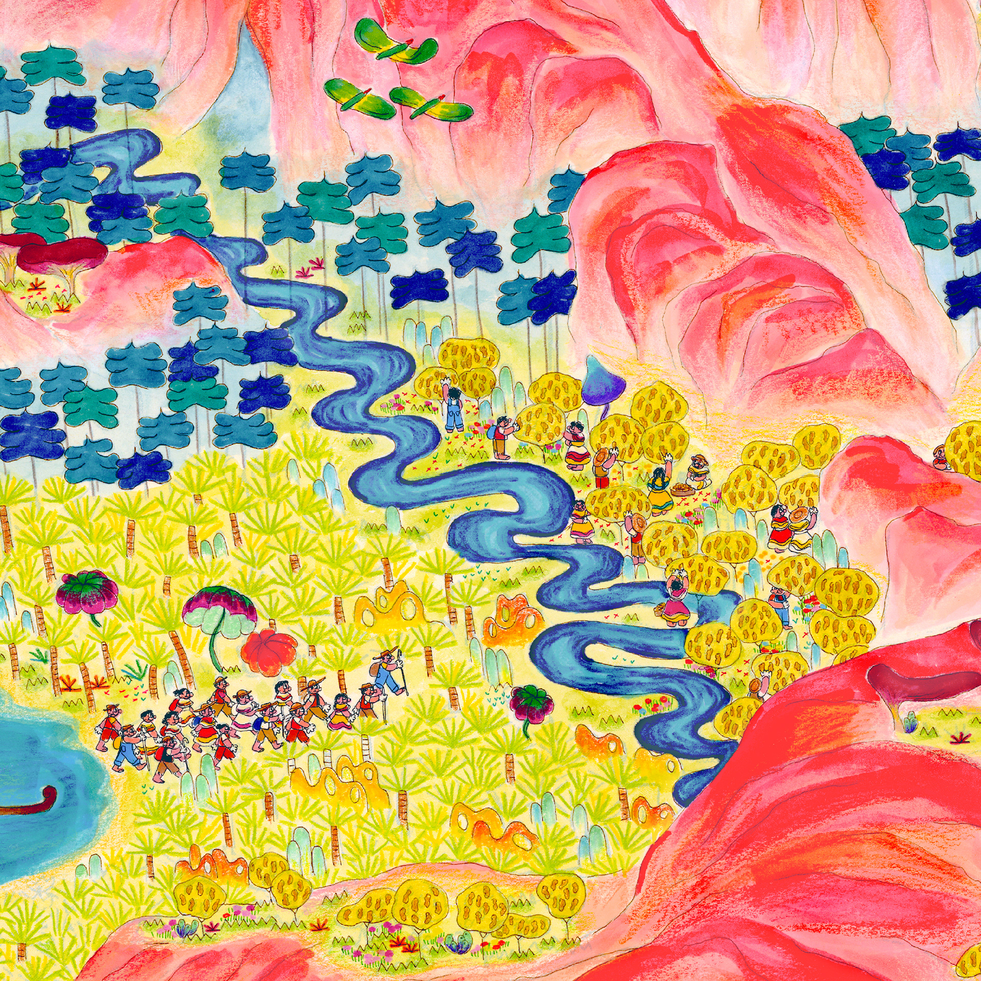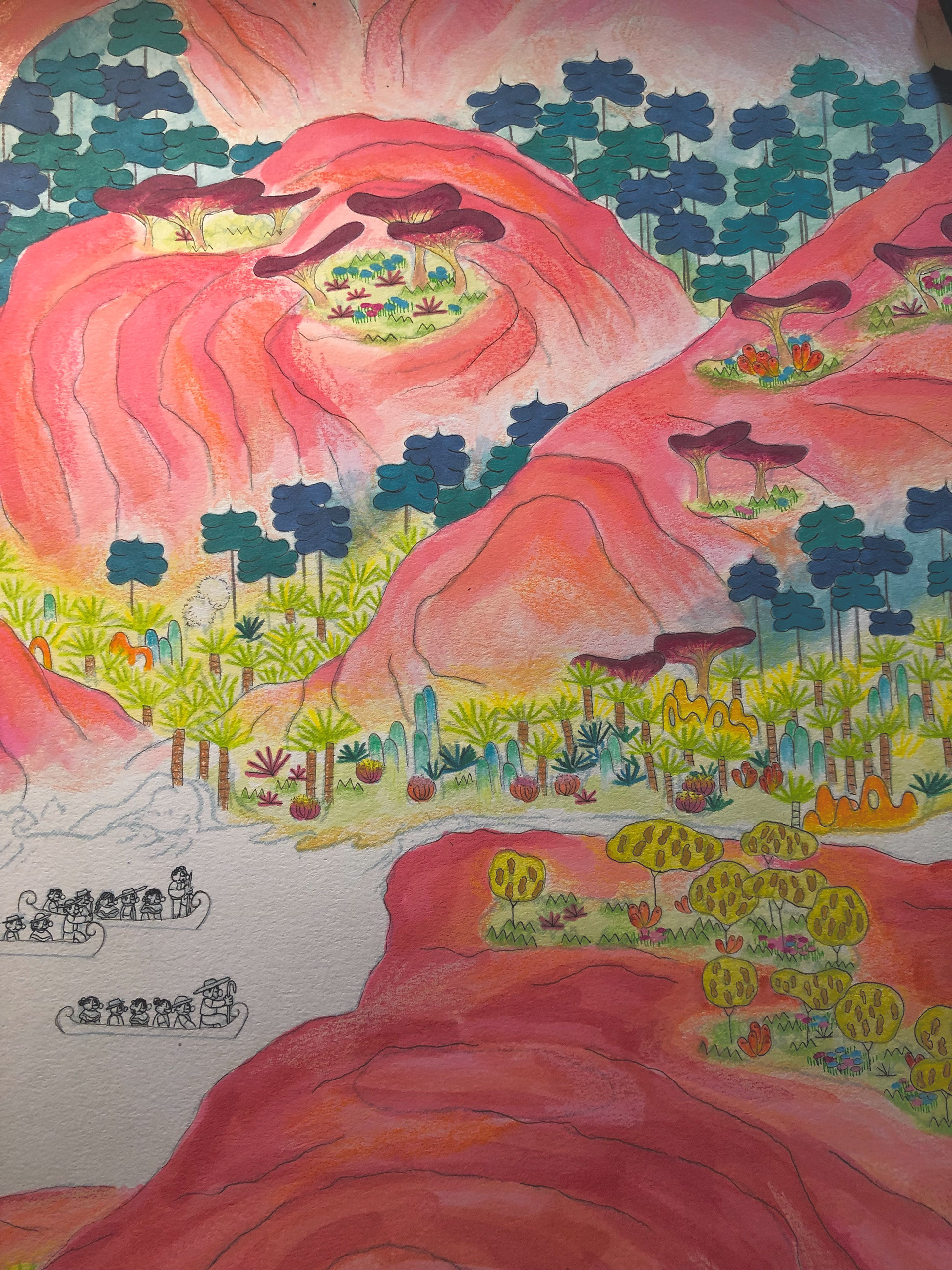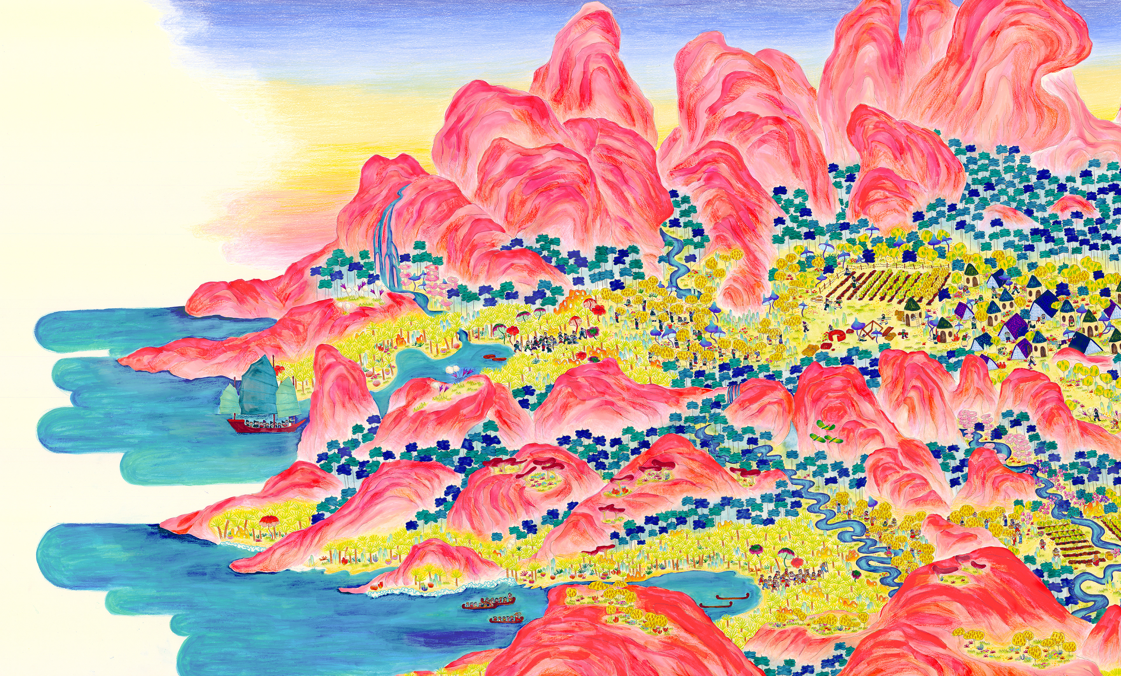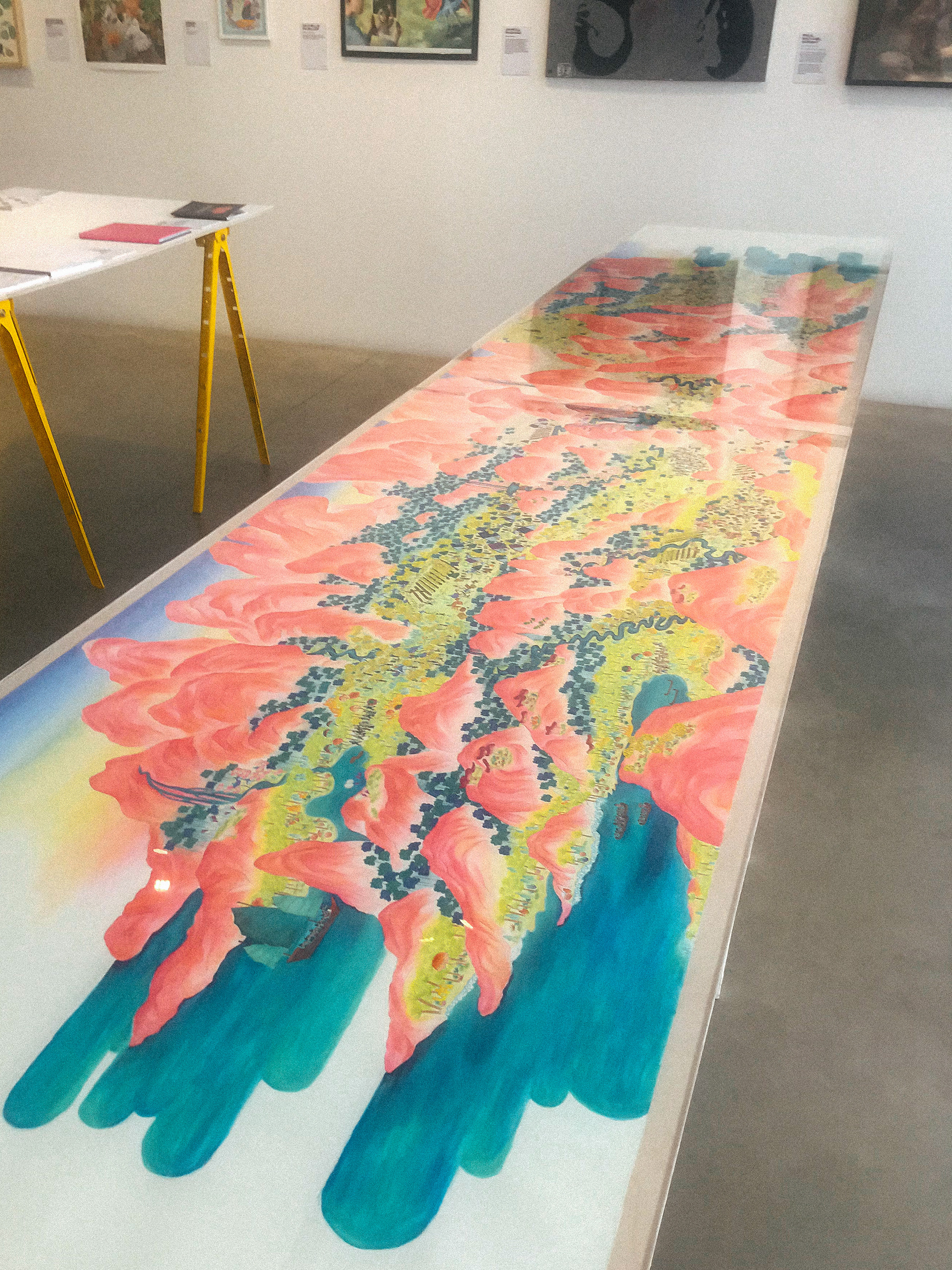 “The History of Peak Posh” is inspired by the relationship of the Dominican Republic with Haiti, as well as the ubiquity of fried chicken restaurants (Pica Pollo) throughout the island. This piece is a story of discovery, conflict, resolution, and harmony set on a delicious island, where fried chicken grows on trees–enjoy. 28"x13ft