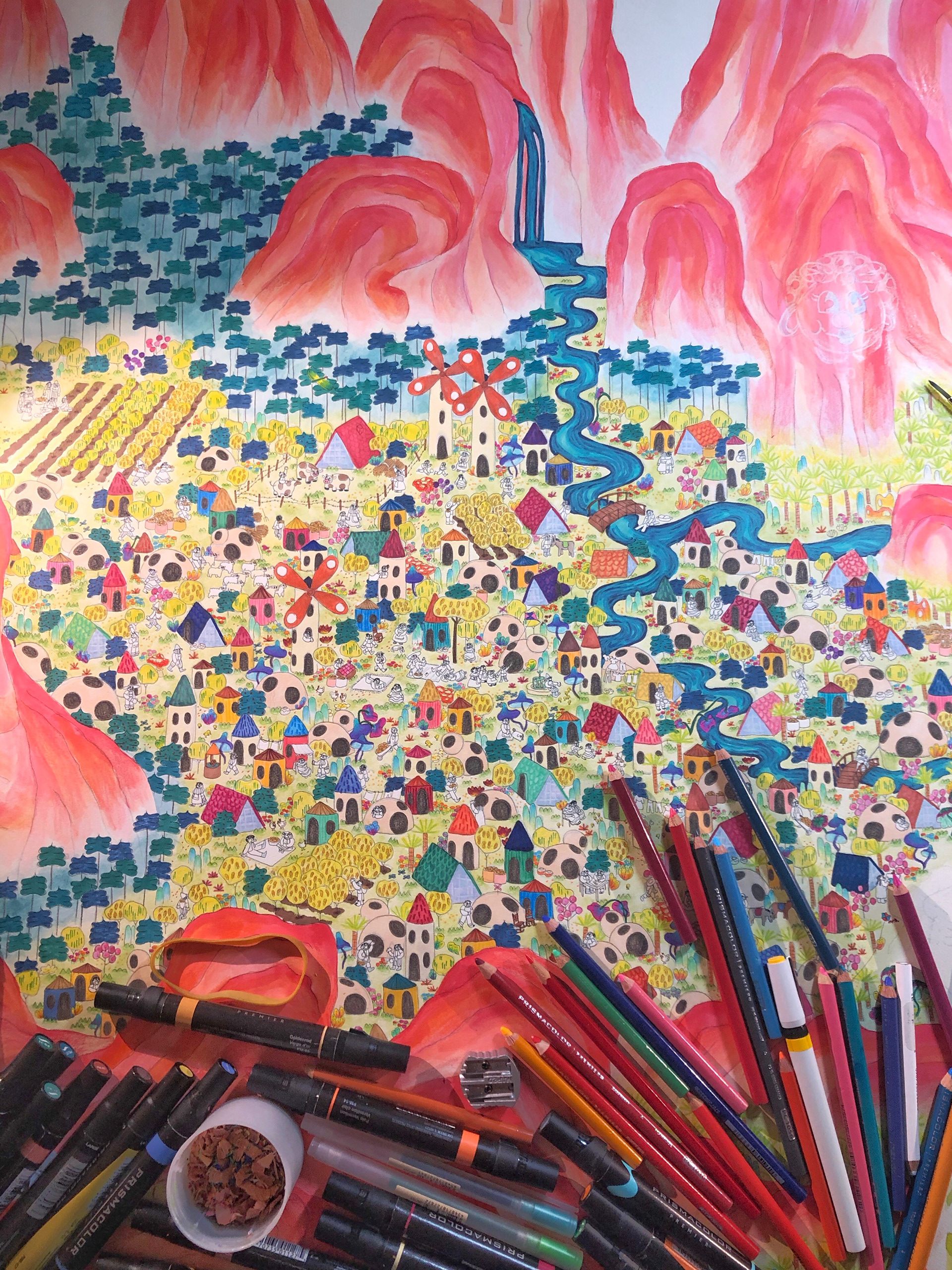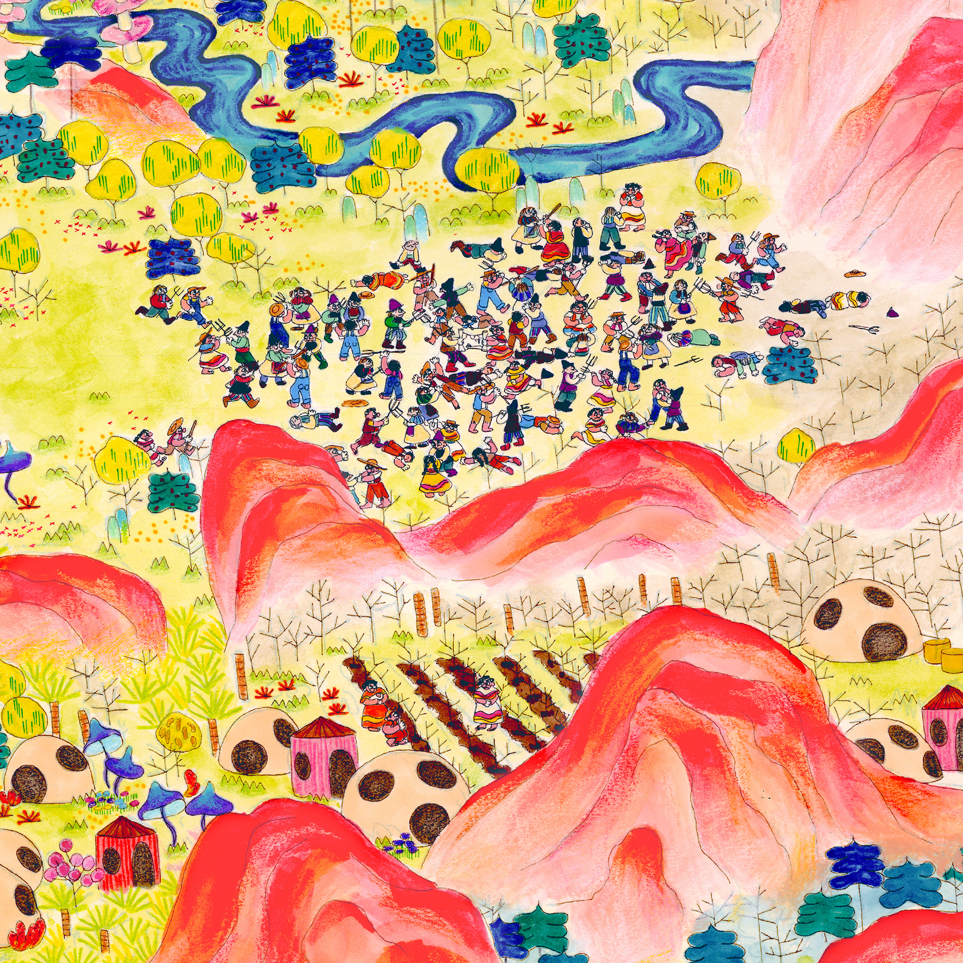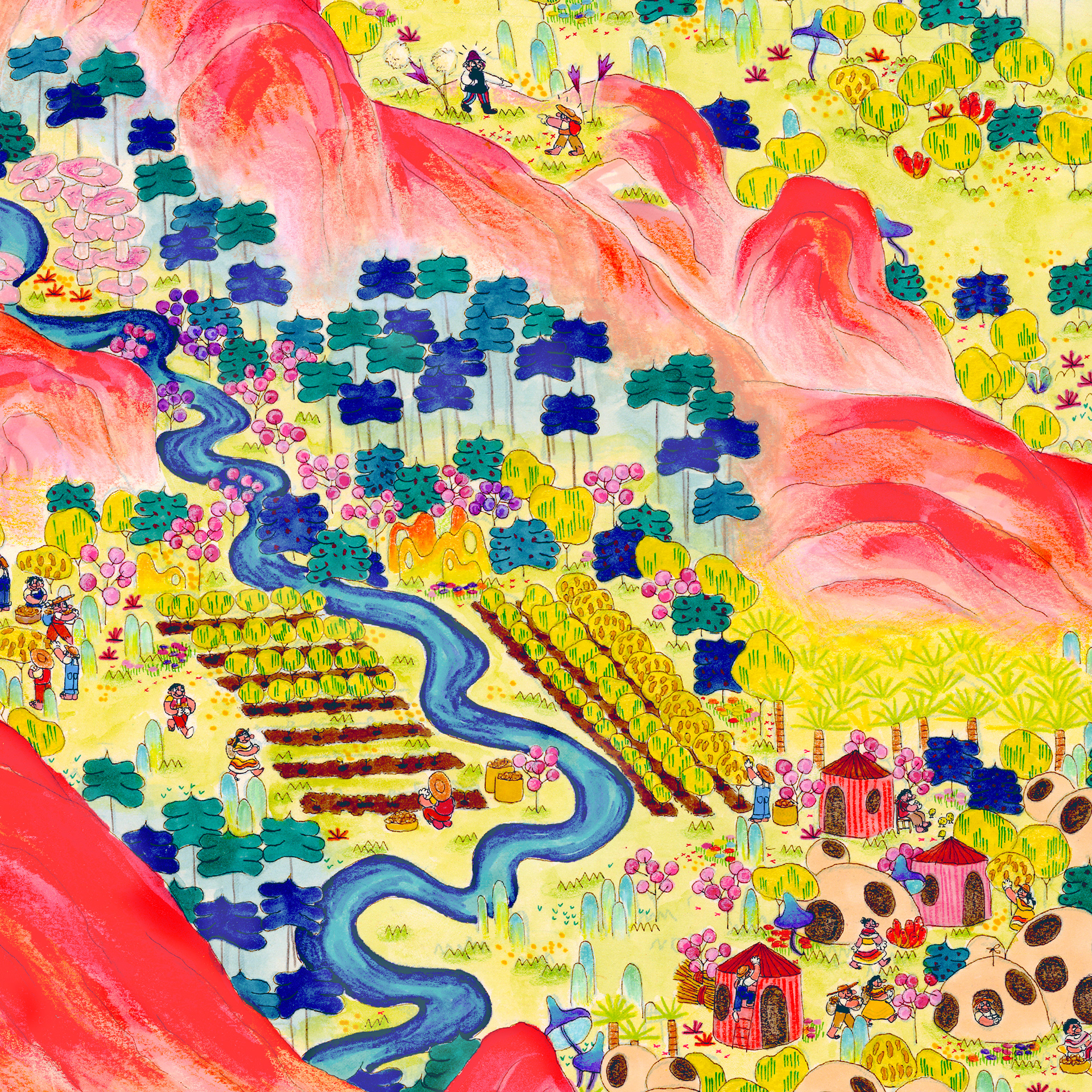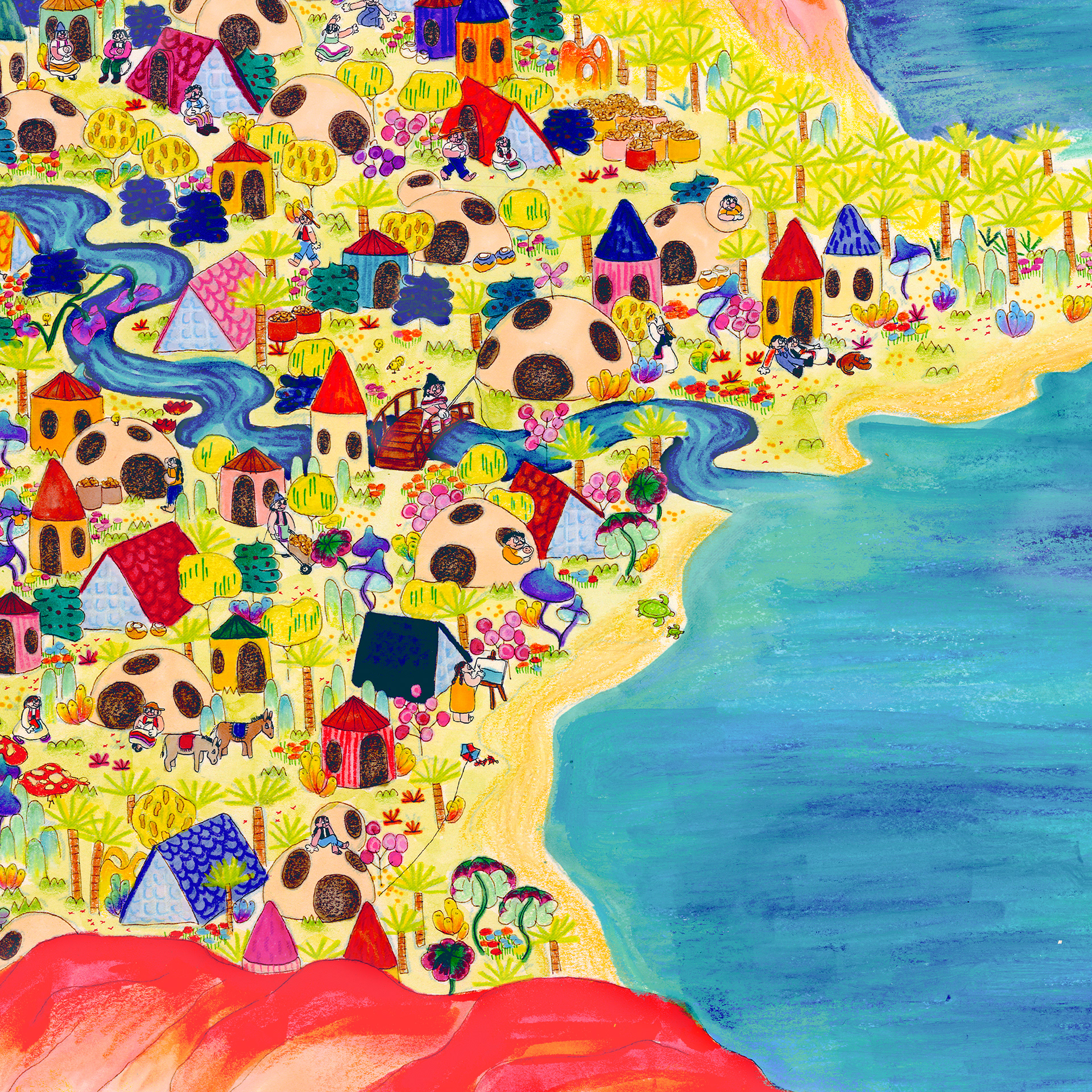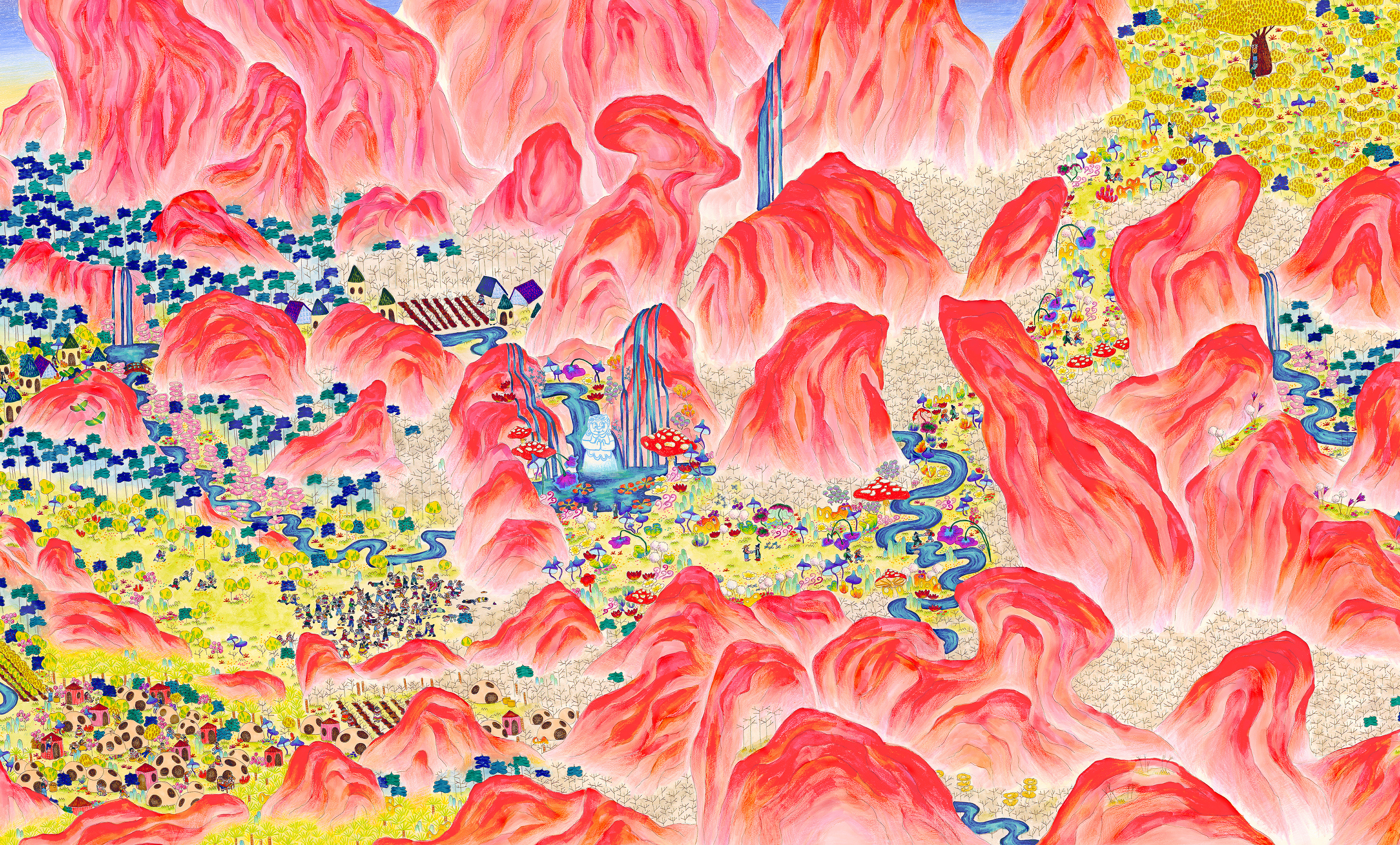 “The History of Peak Posh” is inspired by the relationship of the Dominican Republic with Haiti, as well as the ubiquity of fried chicken restaurants (Pica Pollo) throughout the island. This piece is a story of discovery, conflict, resolution, and harmony set on a delicious island, where fried chicken grows on trees–enjoy. 28"x13ft