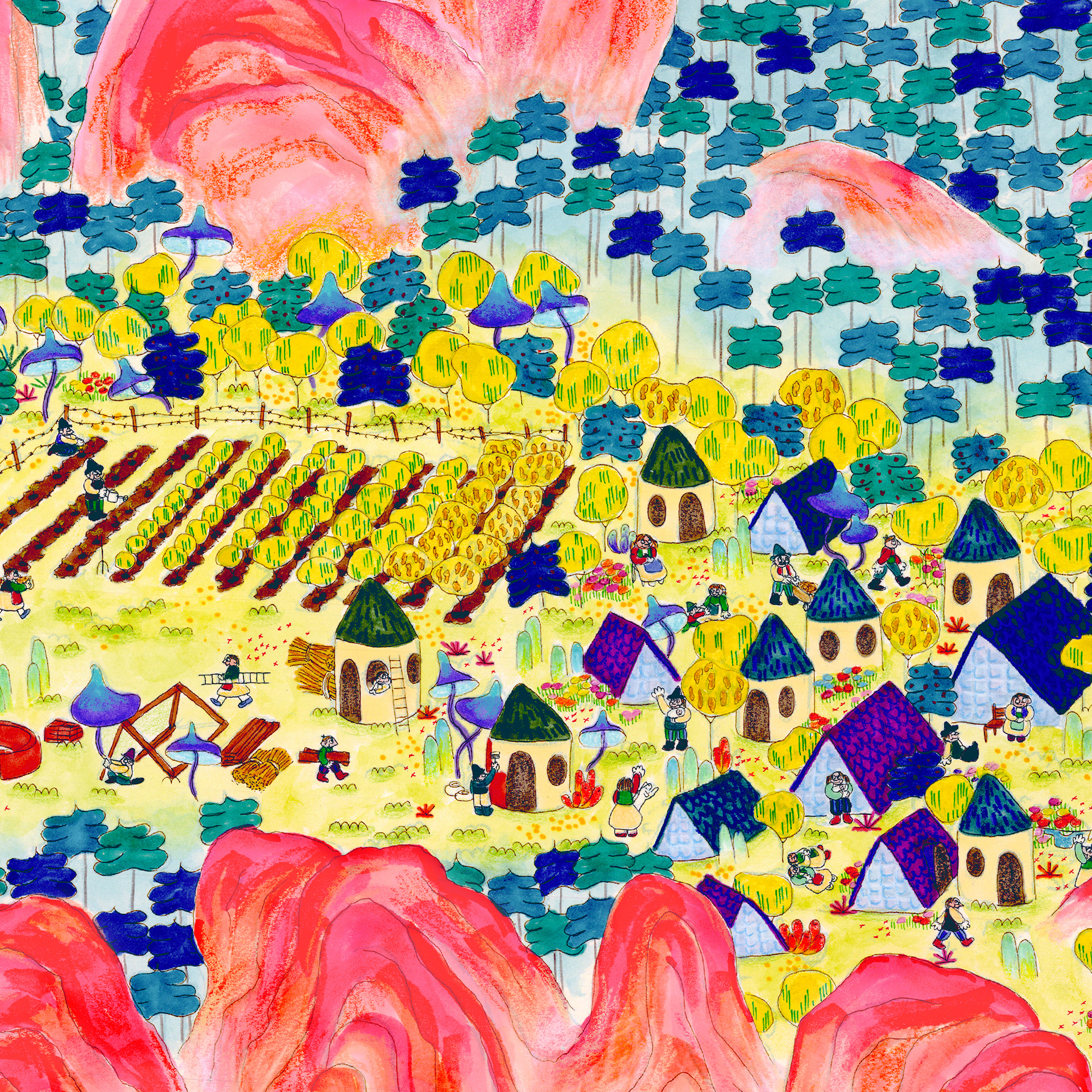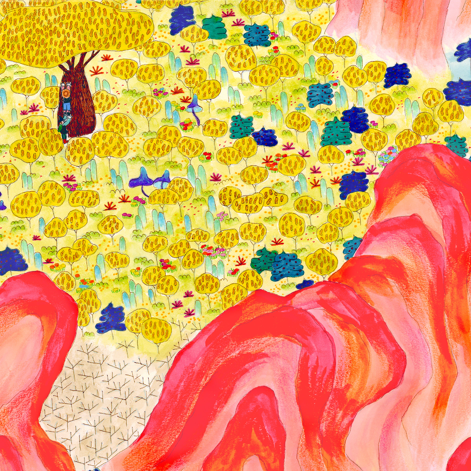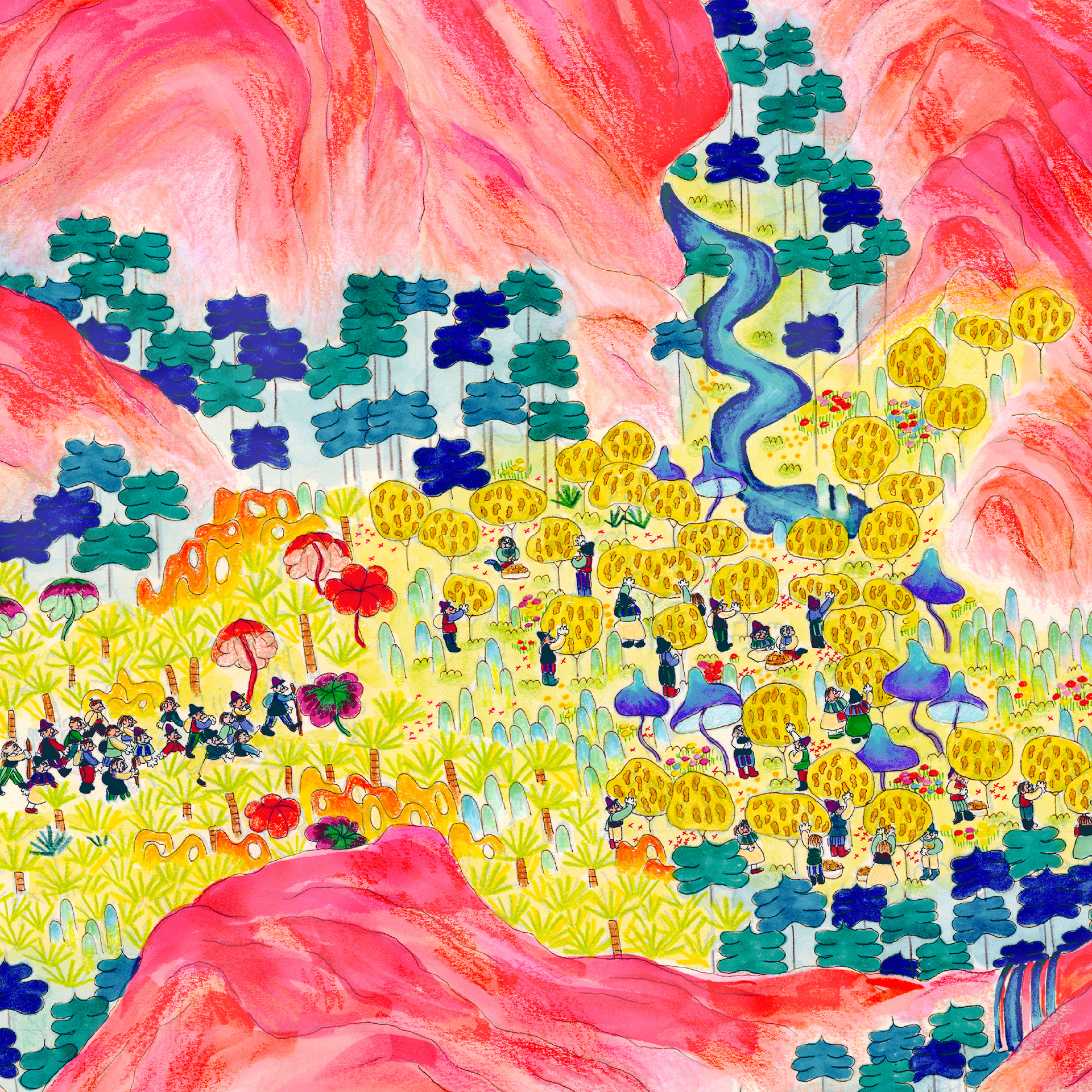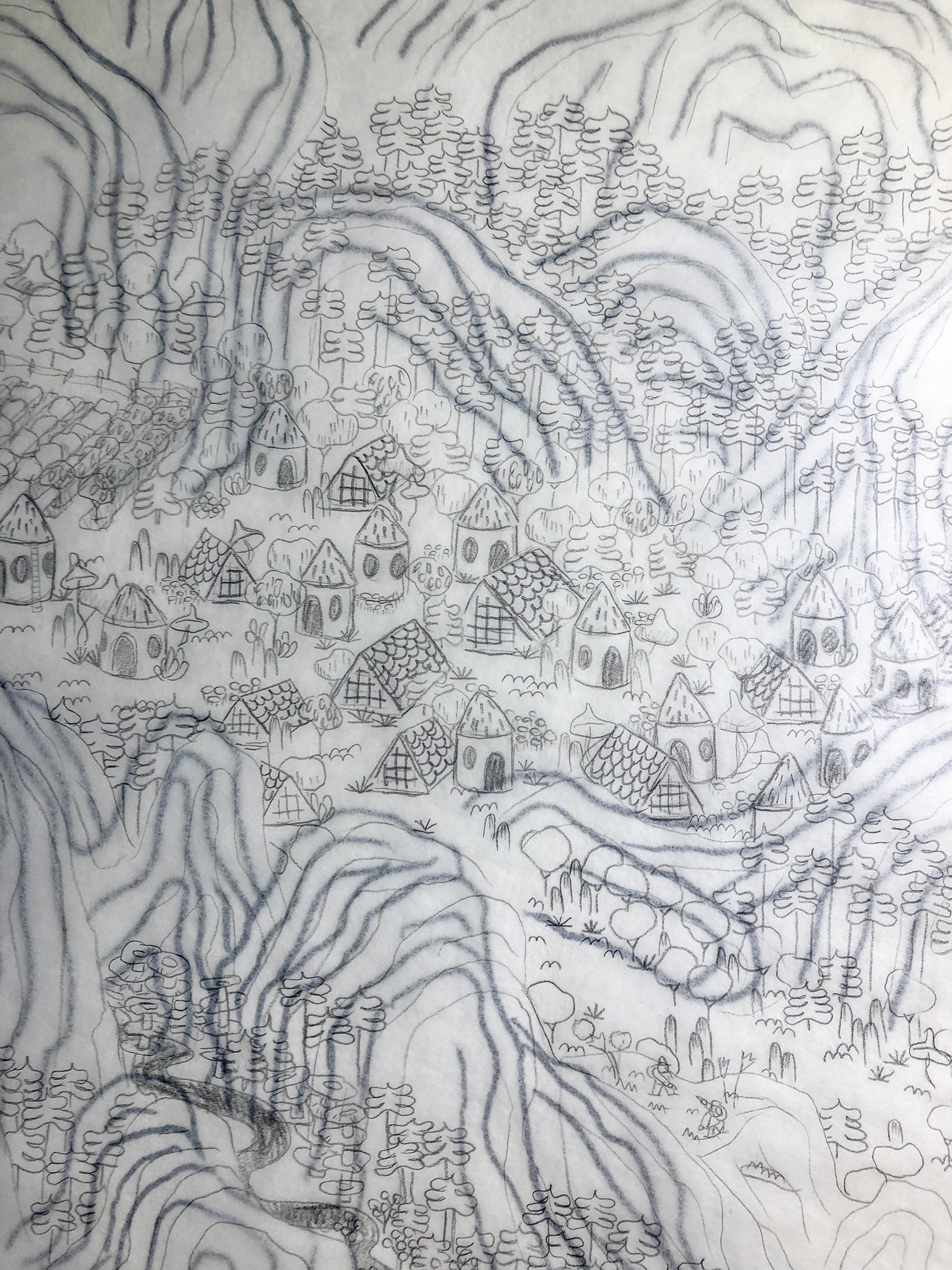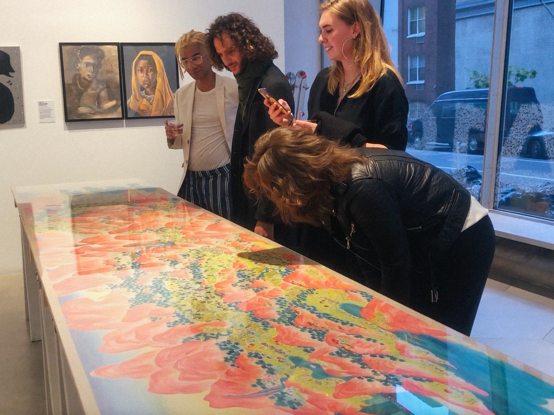 “The History of Peak Posh” is inspired by the relationship of the Dominican Republic with Haiti, as well as the ubiquity of fried chicken restaurants (Pica Pollo) throughout the island. This piece is a story of discovery, conflict, resolution, and harmony set on a delicious island, where fried chicken grows on trees–enjoy. 28"x13ft
